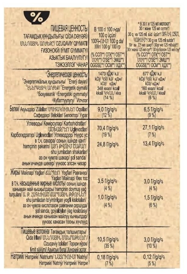 | Состав | зерновые продукты / сахар / сироп глюкозы / Какао порошок с пониженным содержанием жира / витамины и минеральные вещества / соль / ароматизаторы |