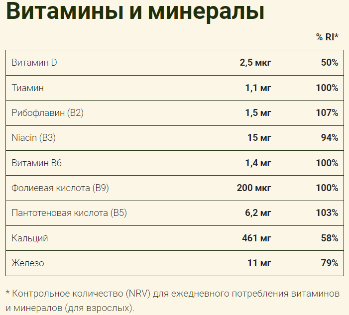 | Витамины и минералы | В3, пантотеновая кислота, D, В6, В1, В2, фолиевая кислота |