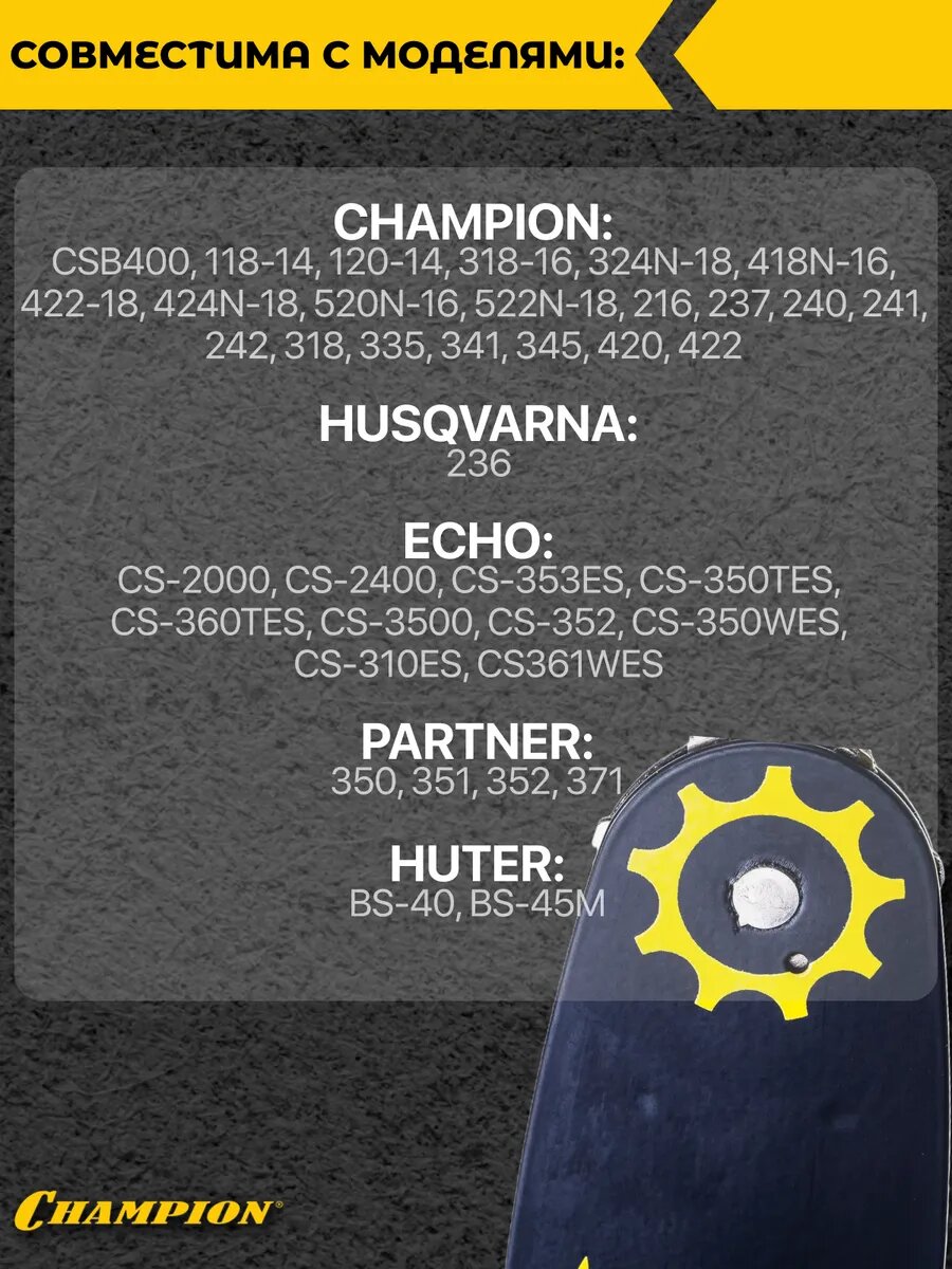 | Совместимость | CHAMPION 242, 341, 335, 345, 216, 318, 420, 422; ECHO CS-353ES, CS-350TES, CS-3500, CS-352, CS-350WES; SHINDAIWA 305S, 352S; HUSQVARNA 236; OLEO-MAC-OLYMPIC 931, 932; PARTNER 350, 351, 352, 371; POULAN 1800, 2000, MICRO25, S25CVA; HITACHI CS280A(B), CS350A(B), CS35B; MAKITA DCS330S, DCS350, DCS390, DCS400, DCS380, UCS3501, UCS3520A; HOMMELITE 3300, 3350, 3550, 3335, 4500; MC CULLOCH 335, 435, 440, 441, 738; EFCO 131,132, 125, 3600, 4000 |