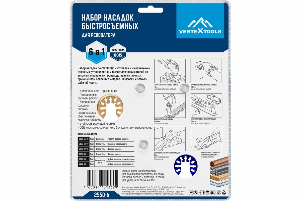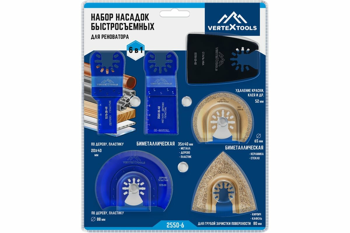 | Дополнительная информация | Набор насадок для реноватора быстросъемная Vertextools 2550-6, 6 шт. |