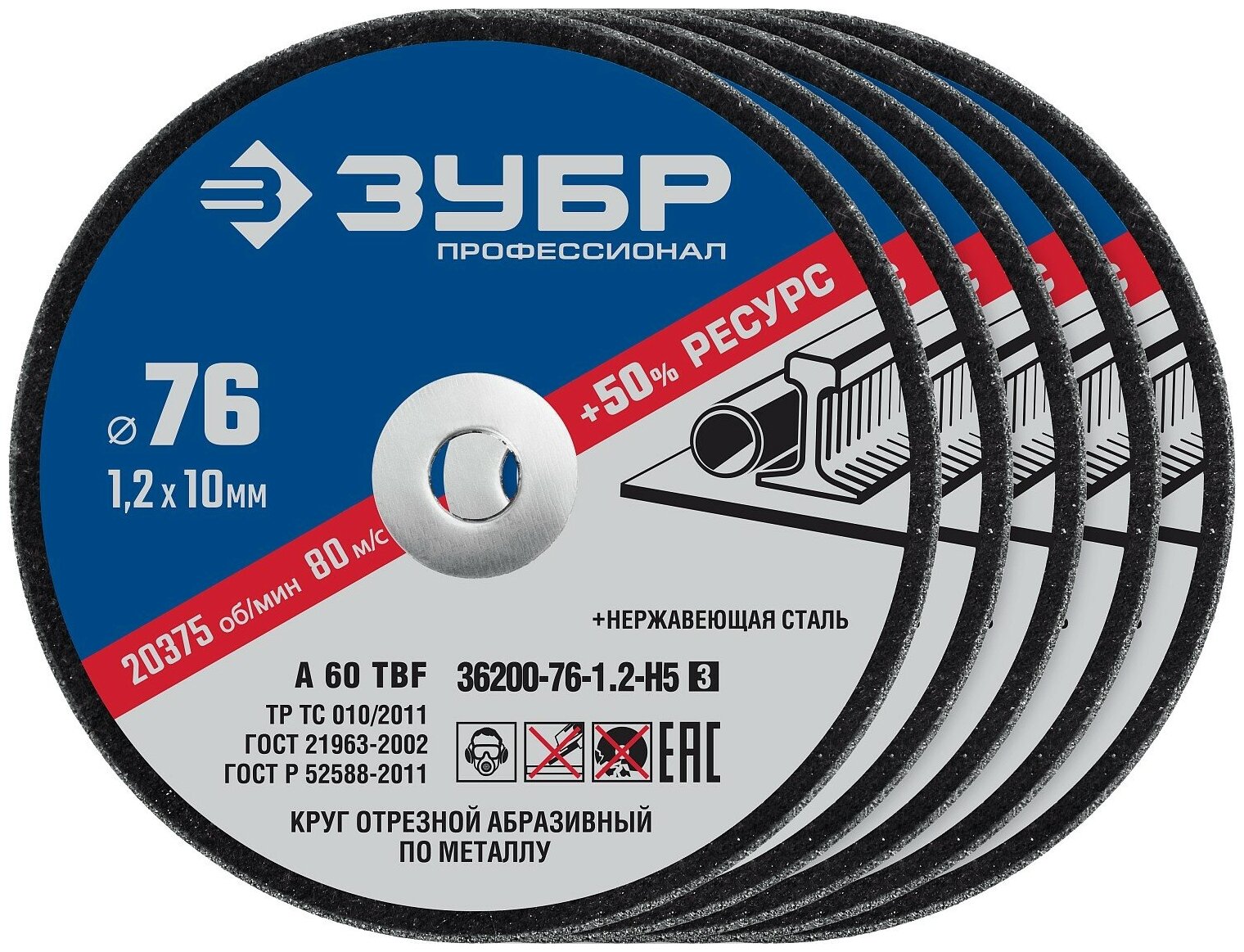 Купить Набор 5 шт: Круги отрезные ″X-2″ по металлу 76х1,2х10 мм, ЗУБР, 36200-76-1.2-H5