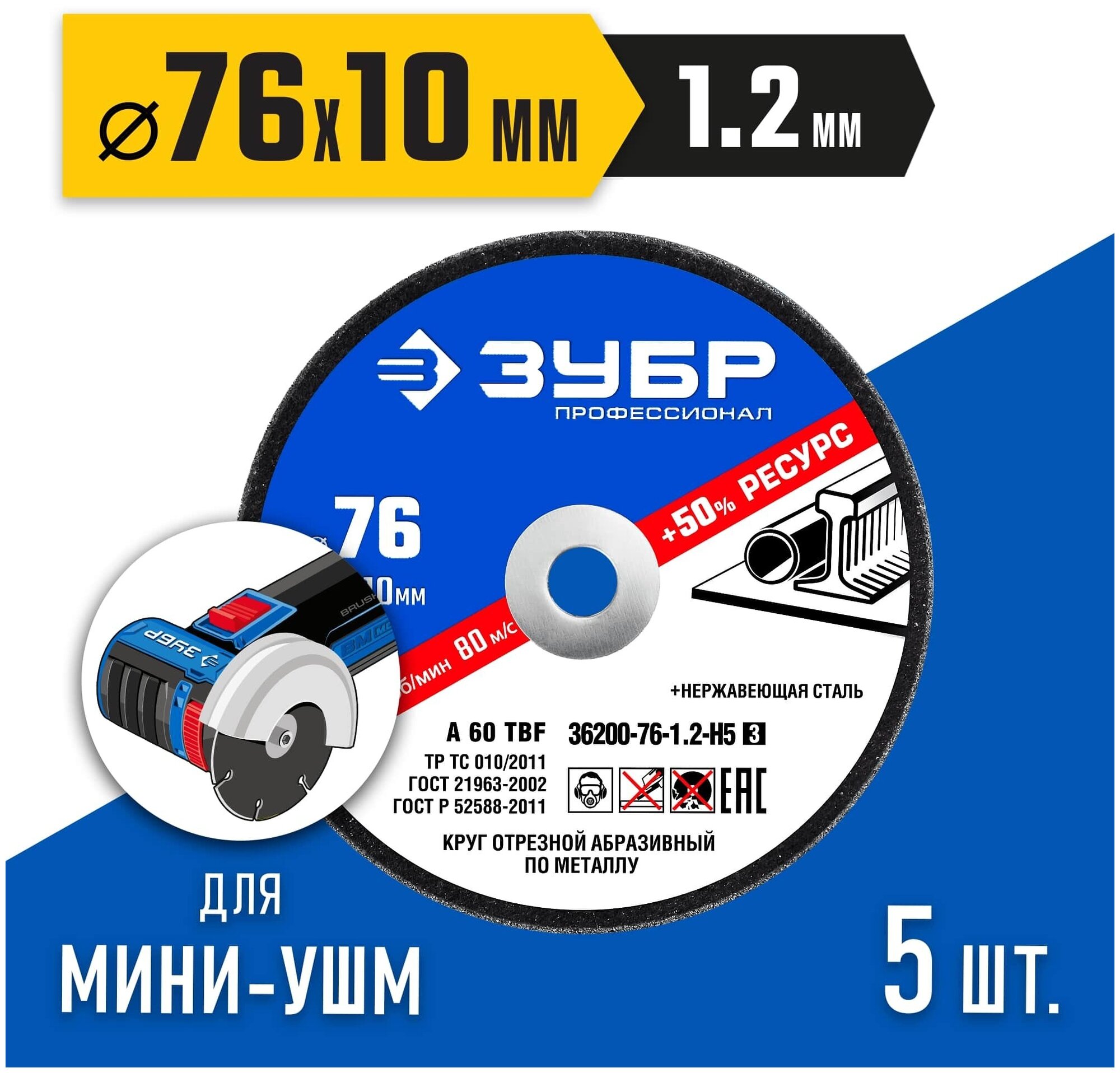 ЗУБР X-2 76 x 1.2 x 10 мм, 5 шт, для мини УШМ, ″AB-76″, набор кругов отрезныx по металлу, профессионал (36200-76-1.2-H5)