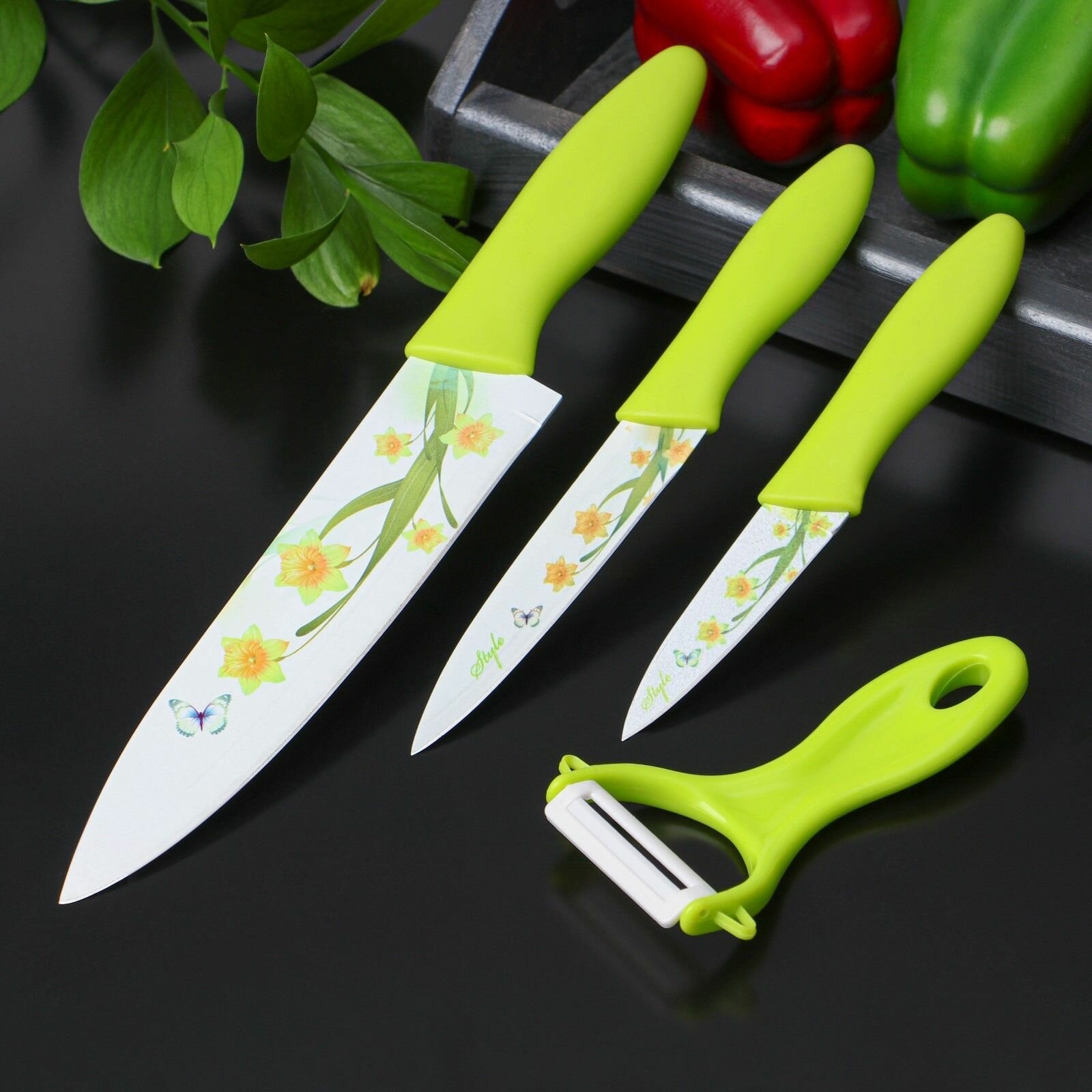 Набор кухонный, 4 предмета: 3 ножа с антиналипающим покрытием, лезвие 8,5 см, 12 см, 20 см, овощечистка, цвет зелёный
