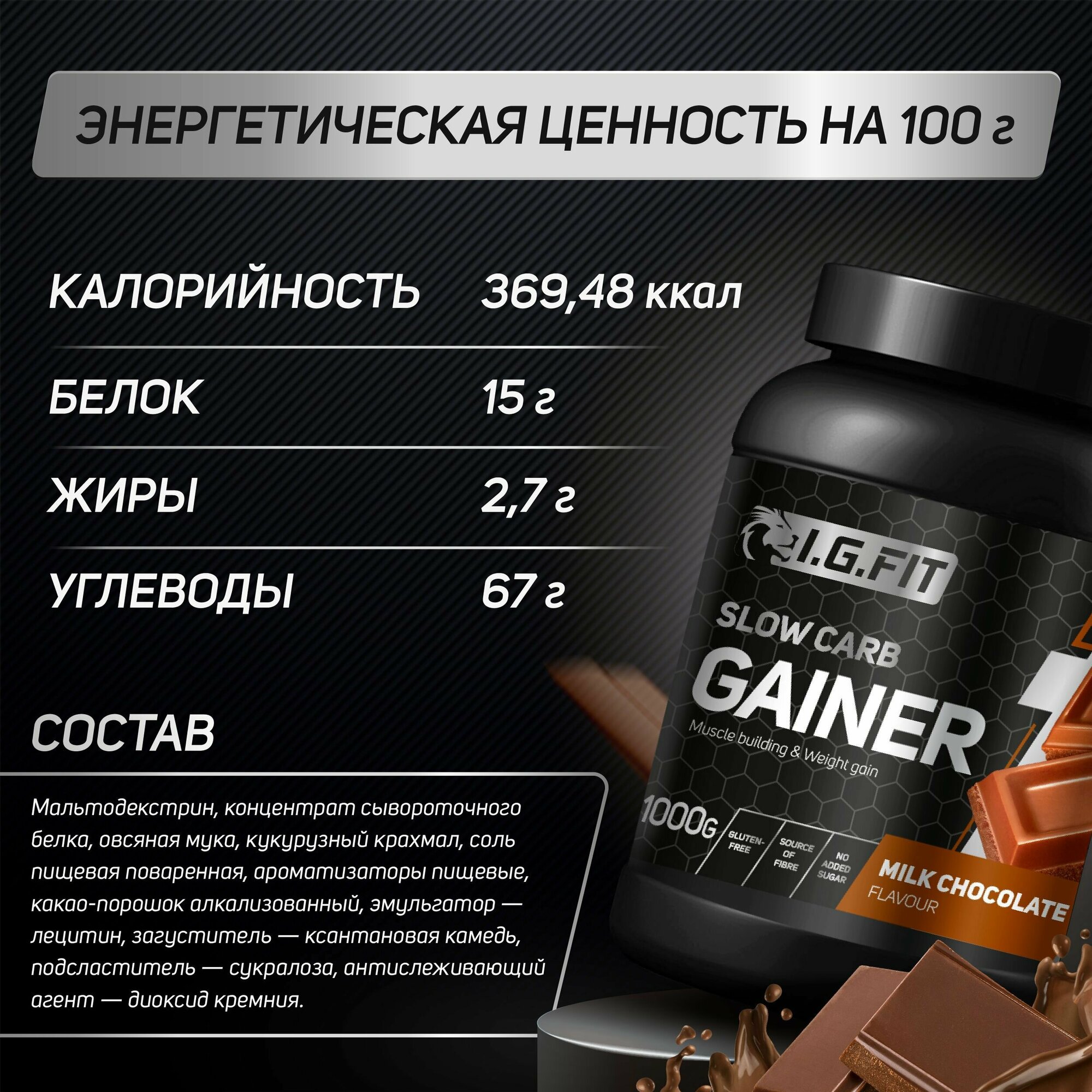 Гейнер I.G. FIT на сложных (медленных) углеводах со вкусом молочный шоколад, 1000г (спортивное питание для набора веса и мышечной массы с мерной ложкой)