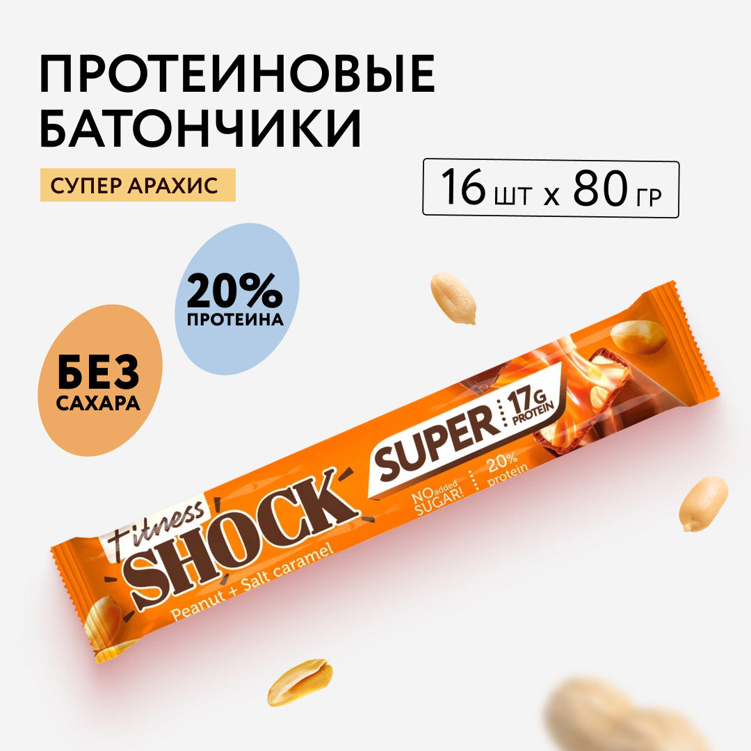 Купить Протеиновые батончики без сахара SUPER Арахис-Соленая карамель FitnesSHOCK 80гр 16 шт