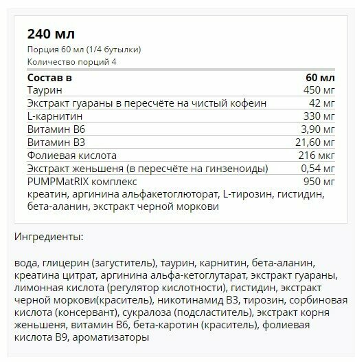 | Основные ингредиенты | аргинин / бета-аланин / витамины и минералы / кофеин / креатин / таурин / экстракт гуараны |