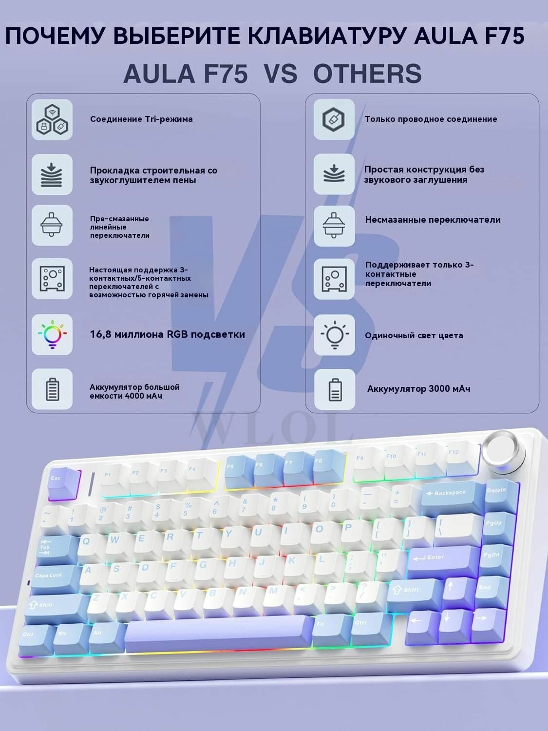 Ниже Вы можете прочитать отзывы на Беспроводная механическая клавиатура Aula F75, 75%, Bluetooth 5.0, 2.4Ghz, USB Type-C, Английская раскладка, ознакомится с подробными характеристиками, посмотреть интересные обзоры и фотографии на Беспроводная механическая клавиатура Aula F75, 75%, Bluetooth 5.0, 2.4Ghz, USB Type-C, Английская раскладка.