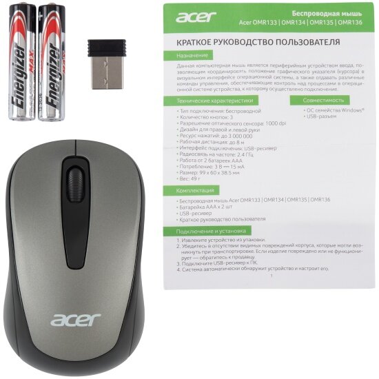 Мышь Acer OMR134, серый (ZL.MCEEE.01H) оптический, 1000 dpi, радиоканал