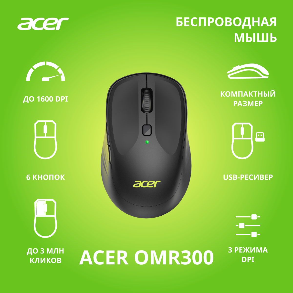 Мышь беспроводная ACER OMR300 , 1600 dpi, USB/Радиоканал, черный (ZL.MCECC.01R)