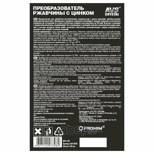 СохранитьПреобразователь ржавчины с цинком цинкач 500мл AVS AVK-185 A07398S (12) Avs Industrial Co A07398S интересное: