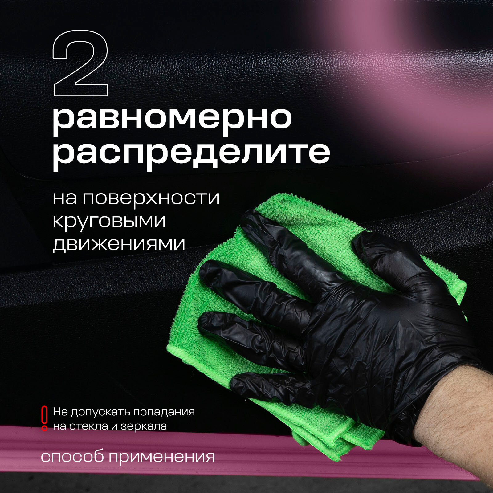 | Способ применения | Нанести на поверхность с помощью распылителя или губки и распределить равномерно по поверхности круговыми движениями. Не допускать попадания на стекла и зеркала. |