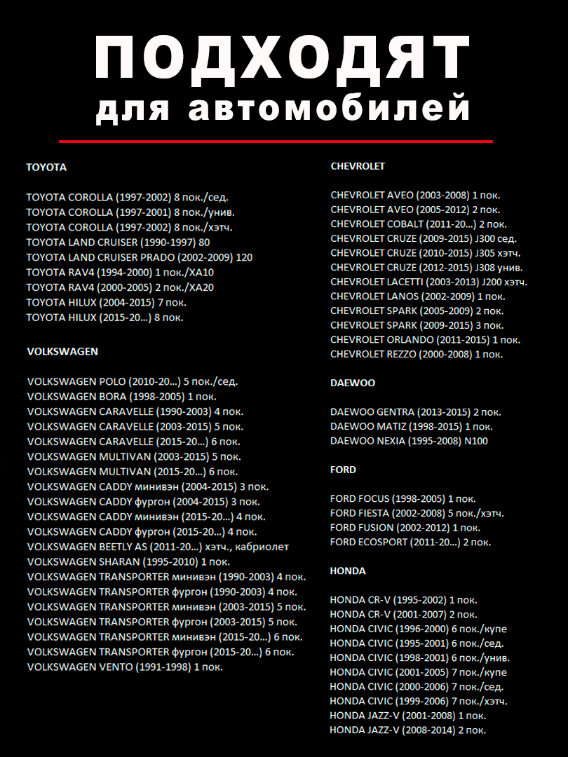 | Тип автотехники | автобусы / грузовые автомобили / Коммерческий транспорт / легковые автомобили |