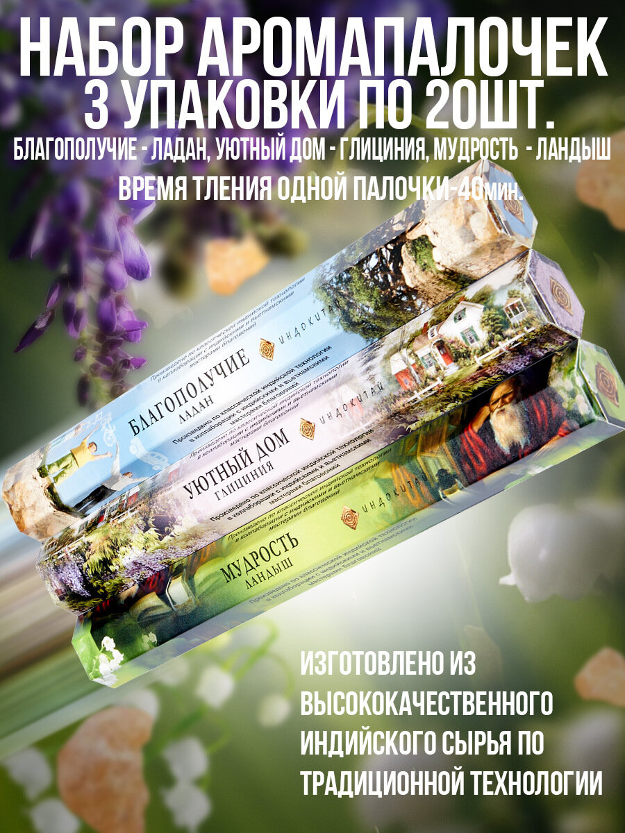 Благовония,Ароматические палочки"Индокитай"-шестигранники,набор из 3 упак,60шт:Уютный дом,Благополучие,Мудрость.