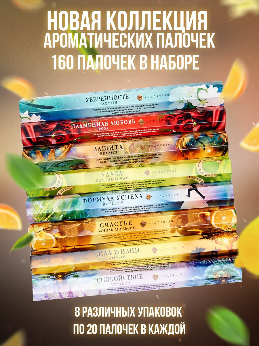 Благовония,Ароматические палочки,Аромапалочки набор"Индокитай" - 8 упаковок по 20 штук-160шт:Лаванда,Лимон,Эвкалипт,Зеленый чай.Роза,Жасмин,Ваниль-Апельсин,Ветривер