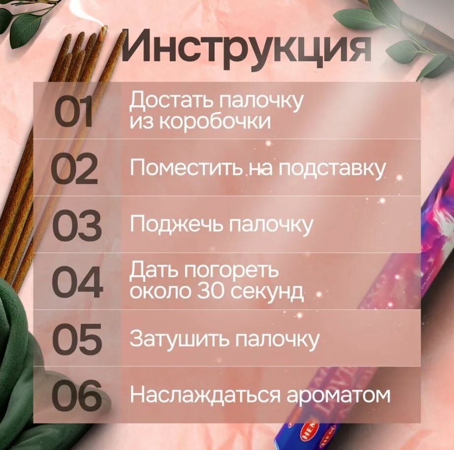 | Комплектация | Палочки ароматические 6 упаковок по 20 штук |