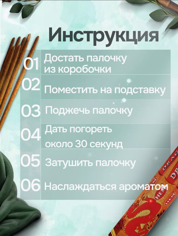 | Комплектация | Палочки ароматические 6 упаковок по 20 штук |