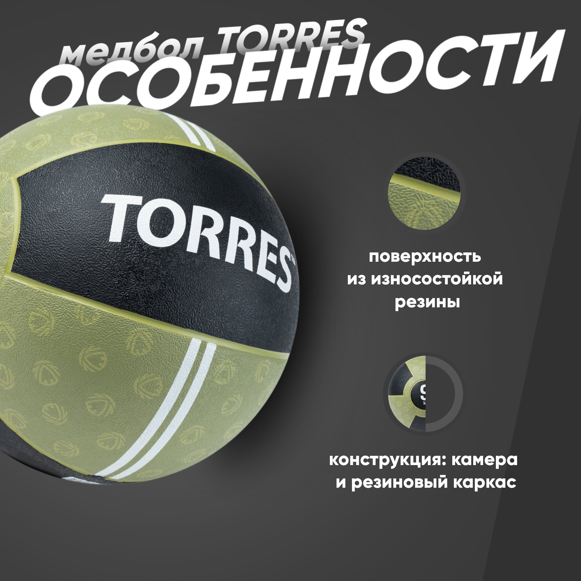 Медбол TORRES AL00239, 9кг, хаки-черный