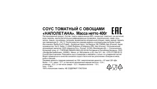 | Дополнительная информация | способ приготовления: разогрейте соус в сковороде и смешайте с только что отваренной пастой; условия хранения: хранить при температуре 3-24°С; после вскрытия упаковки хранить продукт в холодильнике не более 5 дней |