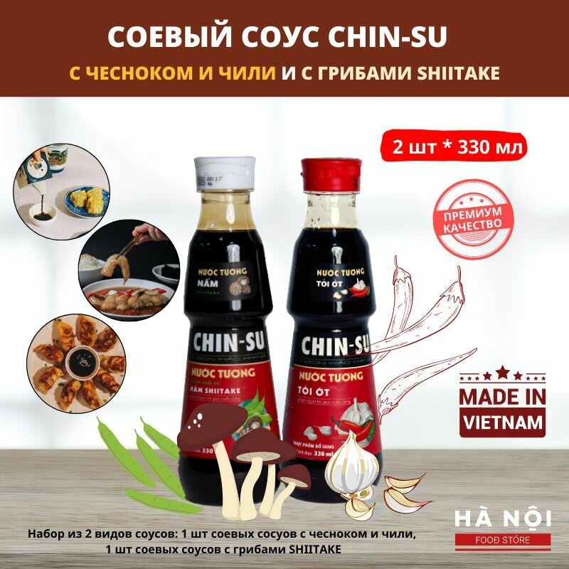 Купить Соевый соус Chin-su Чин-су с грибами шиитаке (shiitake) и чесноком и чили (перцем), 2 вкуса по 1 шт, всего 2 шт.