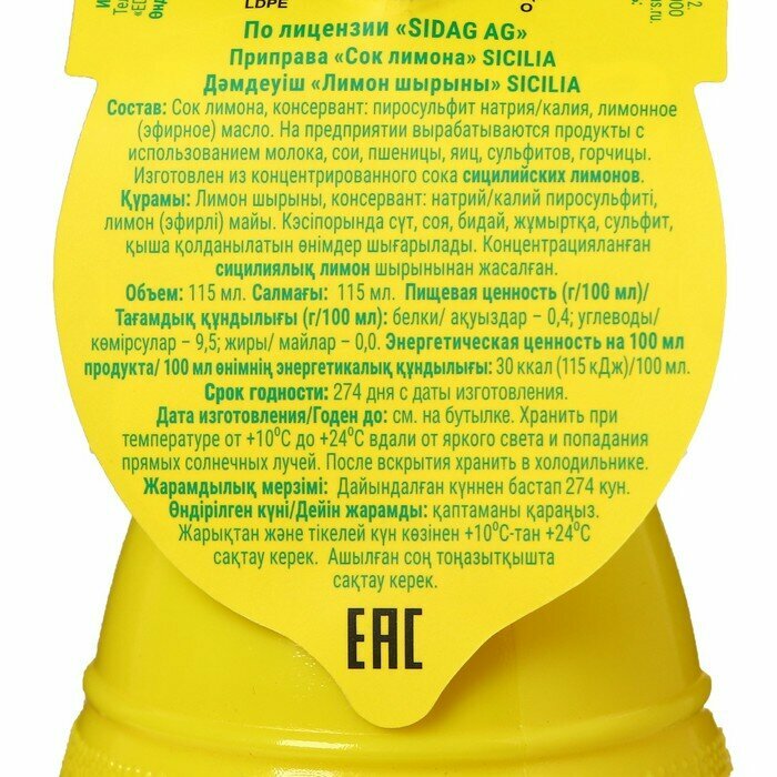 | Состав | сок лимона, консервант: пиросульфит калия Е224, лимонное эфирное масло |