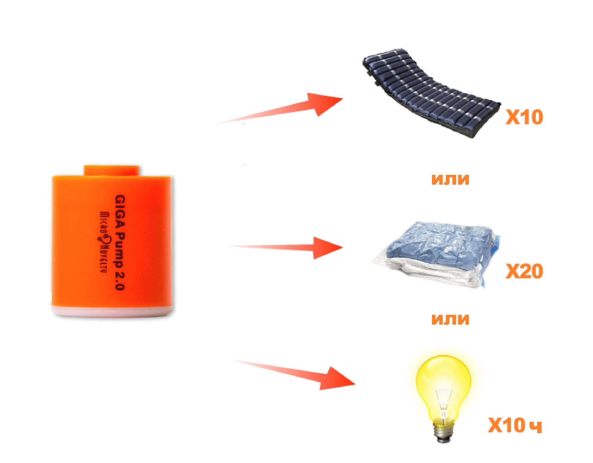 GIGA PUMP 2.0 - Ультрапортативный 3-в-1: насос-надуватель, насос-сдуватель и светильник. Идеально для надувных матрасов, подушек и плавательных кругов