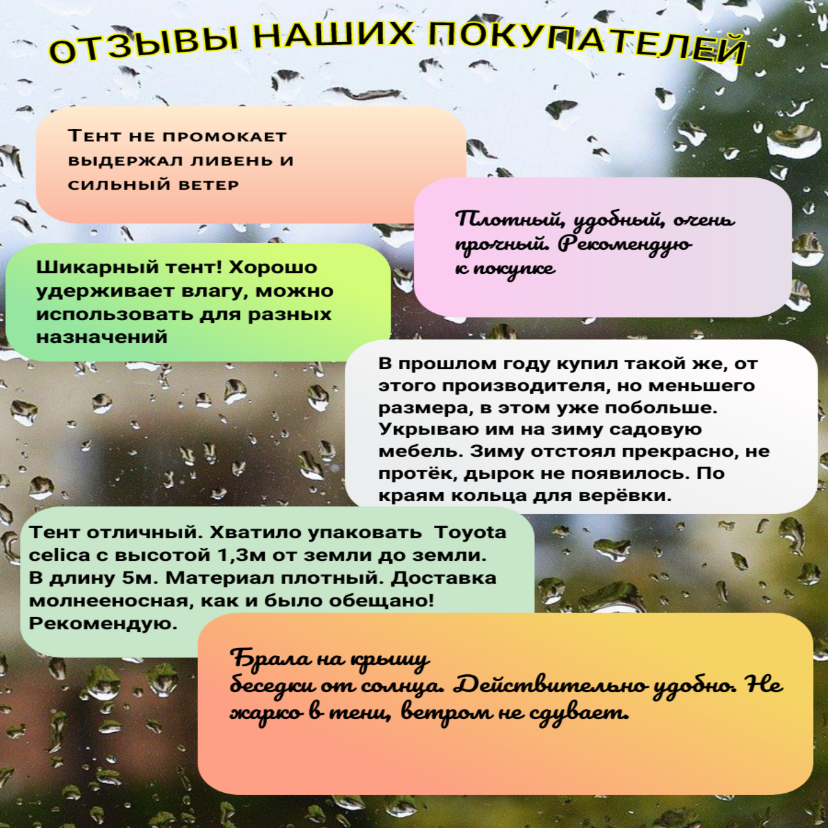 | Дополнительная информация | тент; тент для бассейна;тент от дождя;тент садовый; тент шатер; тент для садовых качелей;тент укрывной;тент туристический;тент для прицепа;полог от дождя; тент для беседки; тент для палатки; тент на песочницу; тент для мотоцикла; тент на крышу; тент строительный; тент на машину; чехол на автомобиль; полог укрывной; пол для палатки; полог туристический; полог универсальный; тент универсальный |