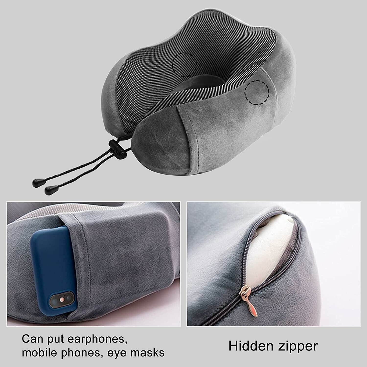 Подушка для путешествий с эффектом памяти Velur Eco серая с карманом