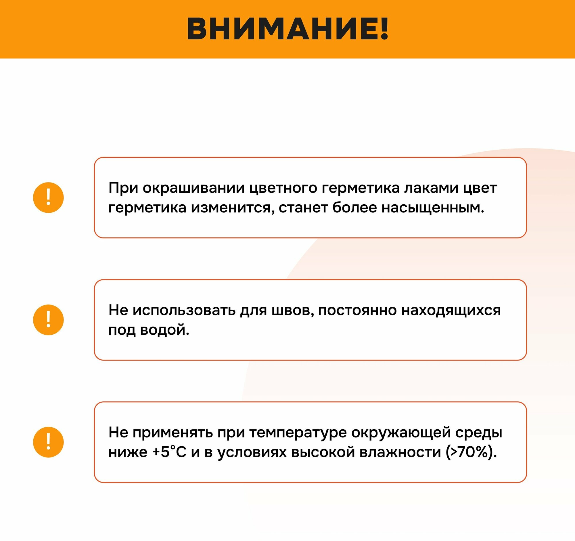 | Дополнительная информация | не использовать для швов, постоянно находящихся под водой; не применять при температуре окружающей среды ниже +5°C и в условиях высокой влажности (>70%) |
