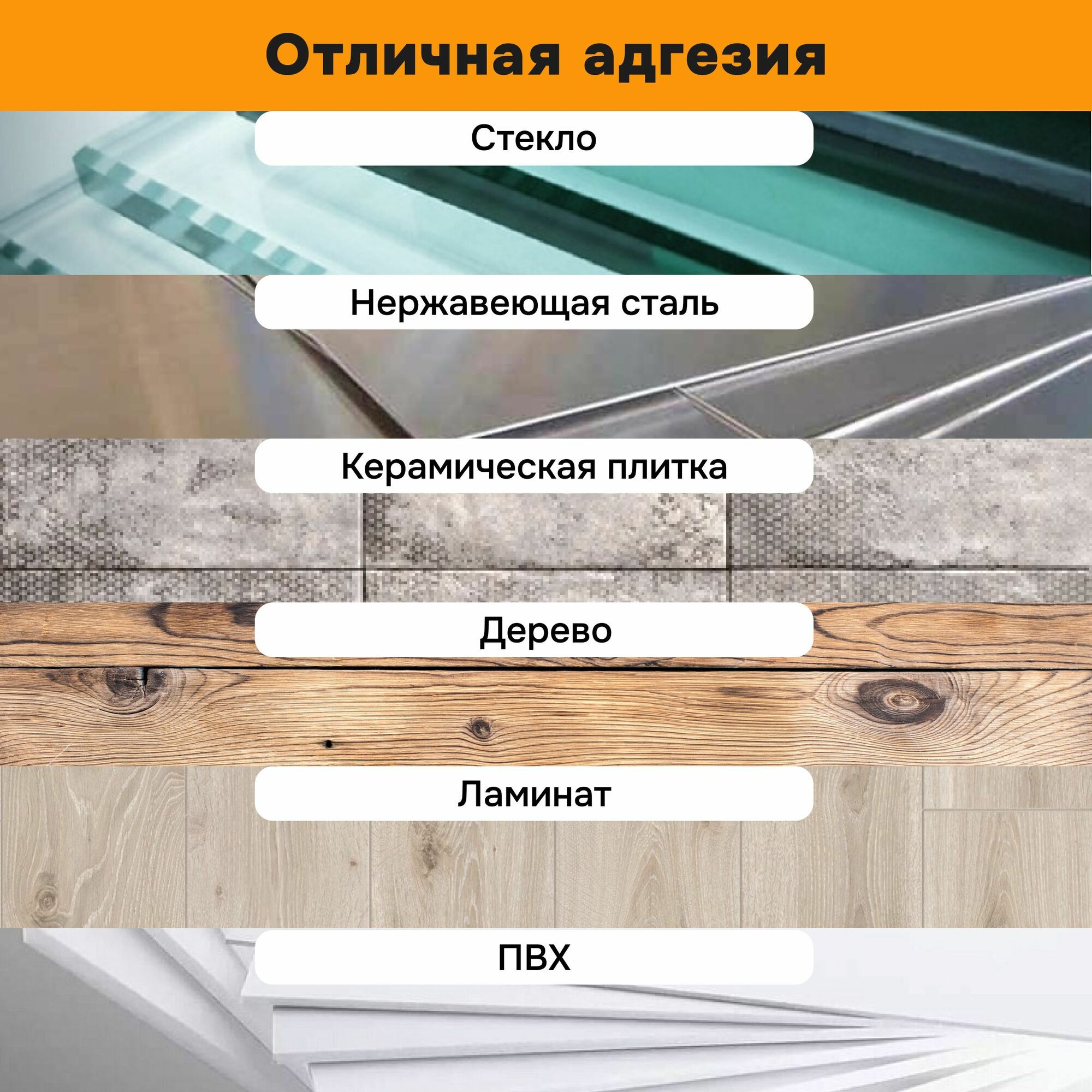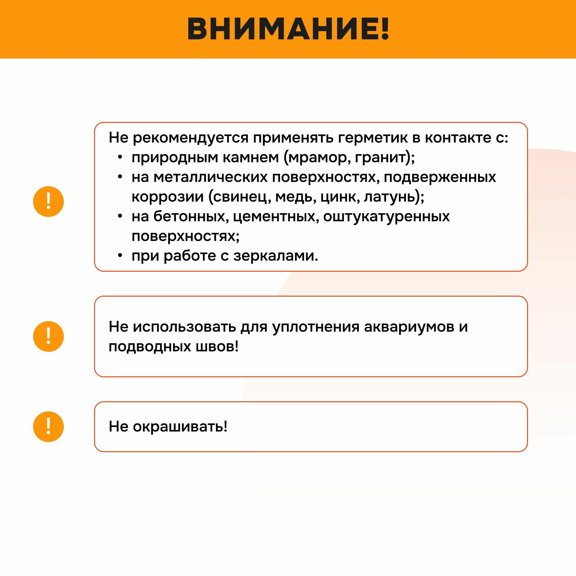 | Дополнительная информация | время образования поверхностной плёнки — 15–30 мин., скорость отверждения герметика — 3 мм в сутки (при температуре +23 °С и относительной влажности 50%); при транспортировке допускается замораживания до –20°С общей продолжительностью не более 30 дней; работы рекомендуется проводить при температуре от +5°С до +40°С, температура герметика должна составлять +20…25 °C; не рекомендуется применять герметик в контакте с природным камнем (мрамор, гранит), на металлических поверхностях, подверженных коррозии (свинец, медь, цинк, латунь), на бетонных, цементных, оштукатуренных поверхностях и при работе с зеркалами; не использовать для уплотнения аквариумов и подводных швов; не окрашивать |
