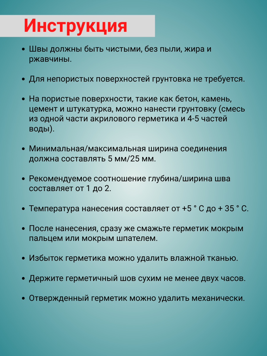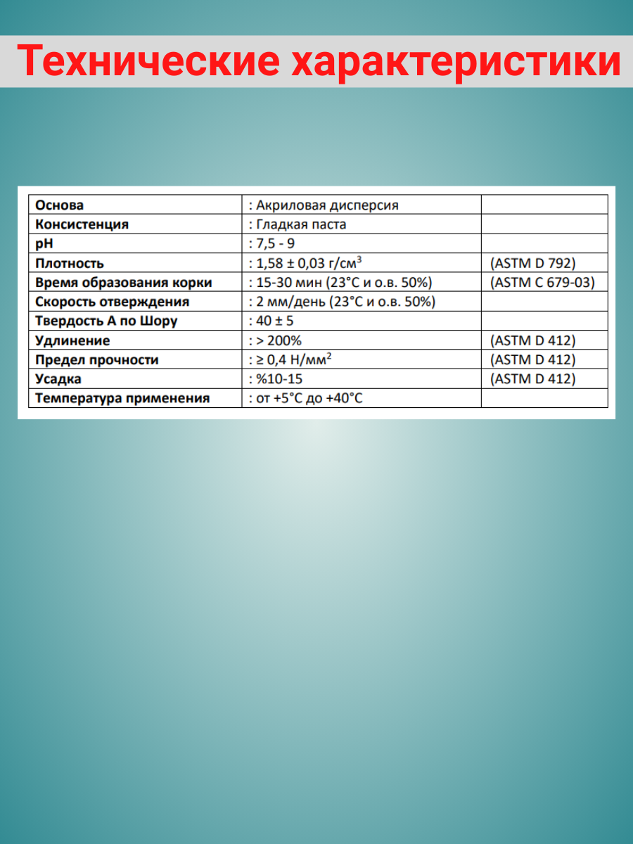 | Особенности | влагостойкость / возможность окрашивания / высокотемпературный / морозостойкий / огнестойкий / термостойкий / устойчивый к УФ-излучению / эластичность |