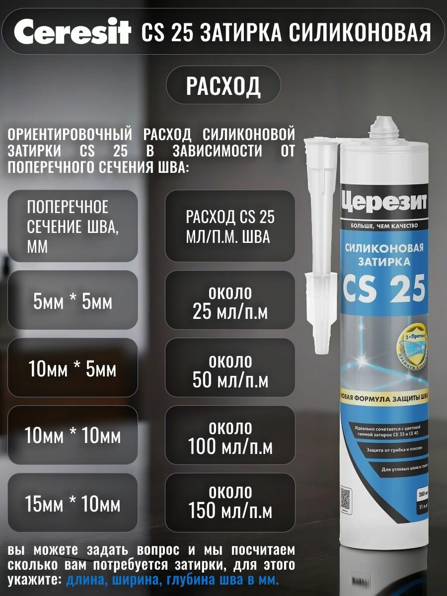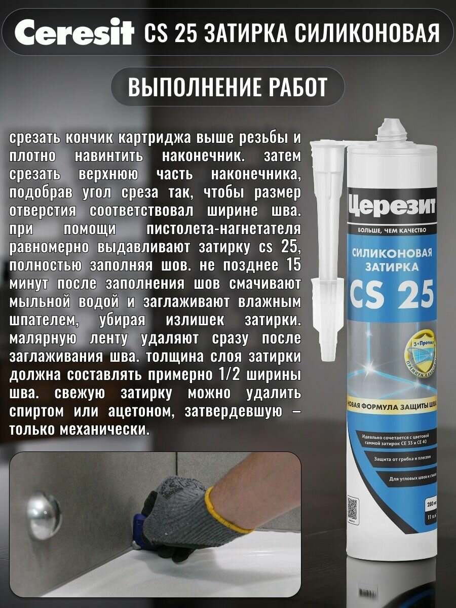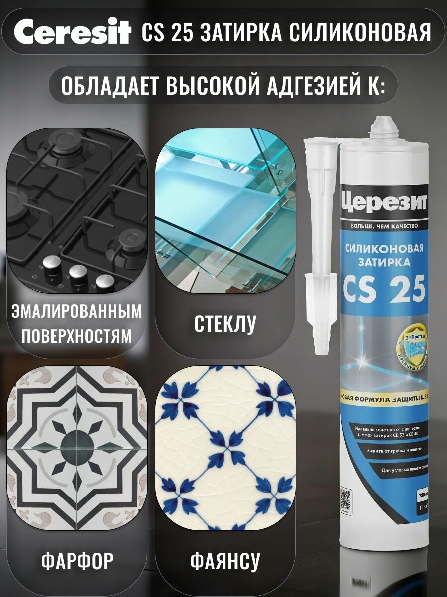 | Подробная комплектация | Герметик-затирка силиконовая противогрибковая Ceresit CS 25 41 натура 280 мл, 1 шт. |