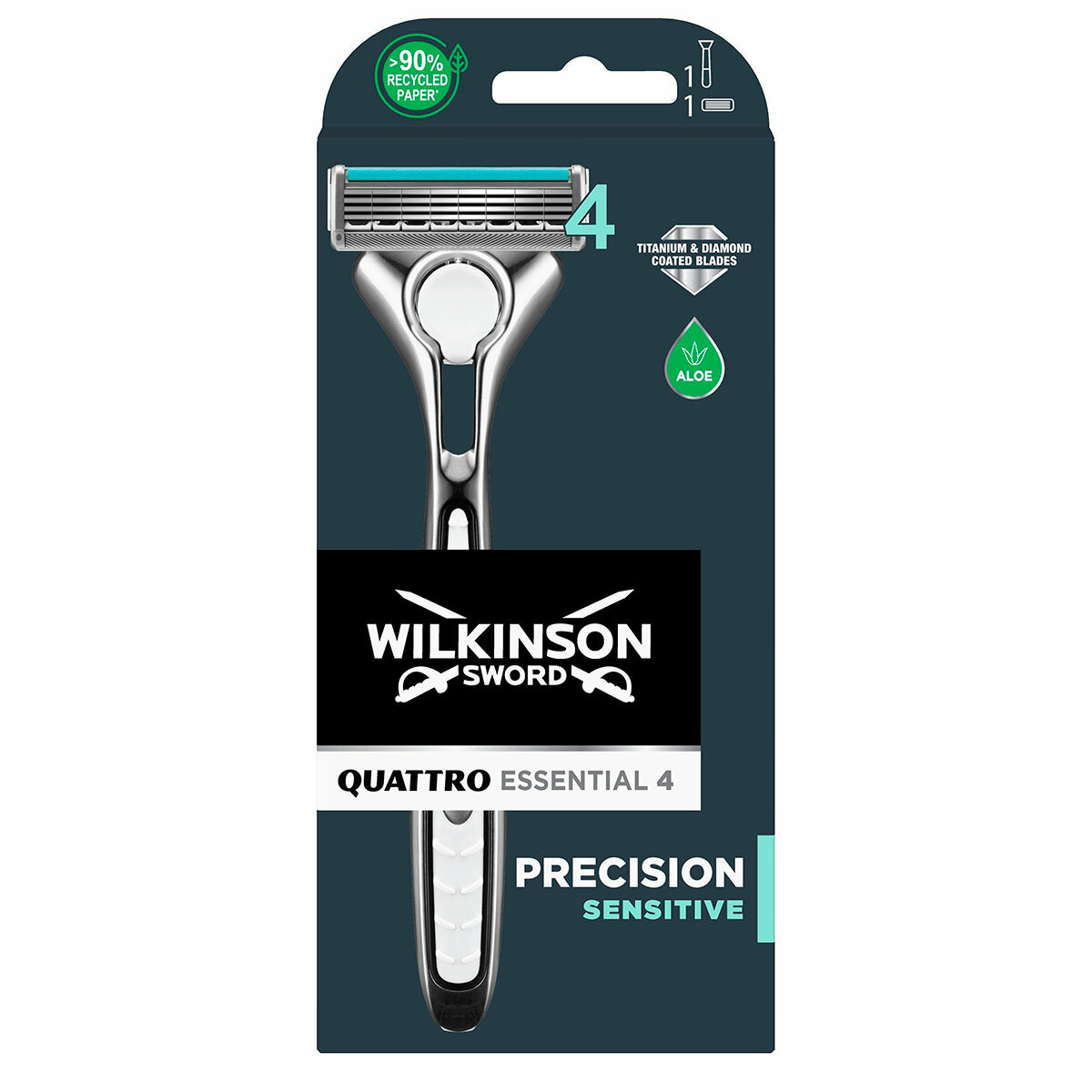 Купить Wilkinson Sword Бритва QUATTRO Titanium Essential Sensitive (1 станок, 1 кассета), 4 лезвия + лезвие-триммер, плав. головка, увл. полоска, прорезиненная ручка