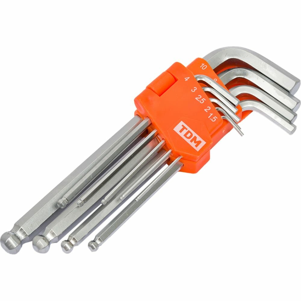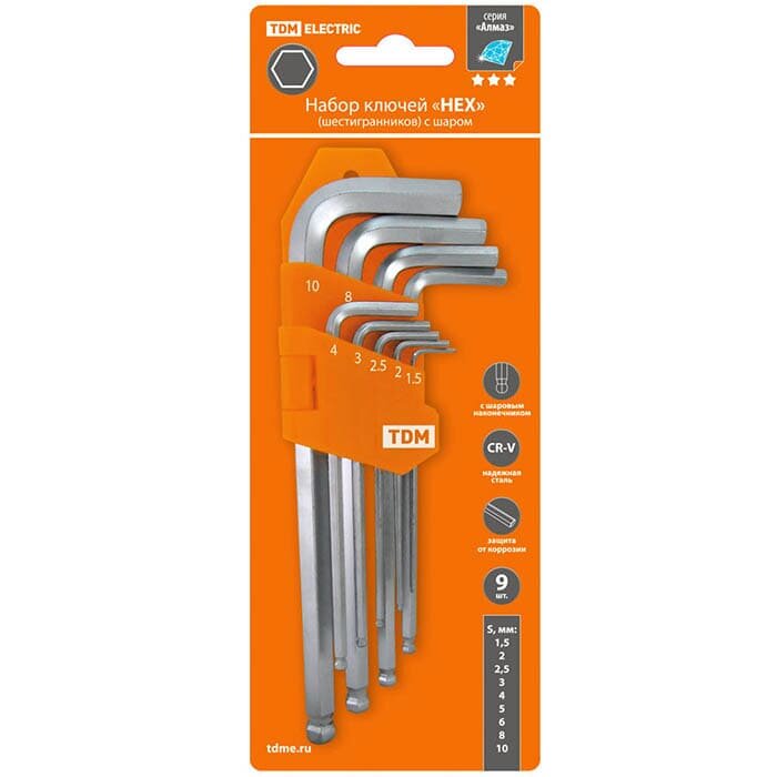 Купить Набор ключей шестигранный, Алмаз, 9 предметов, TDM Electric, 1.5-10 мм, CrV сталь, HEX, длинные с шаром, блистер, SQ1020-0104