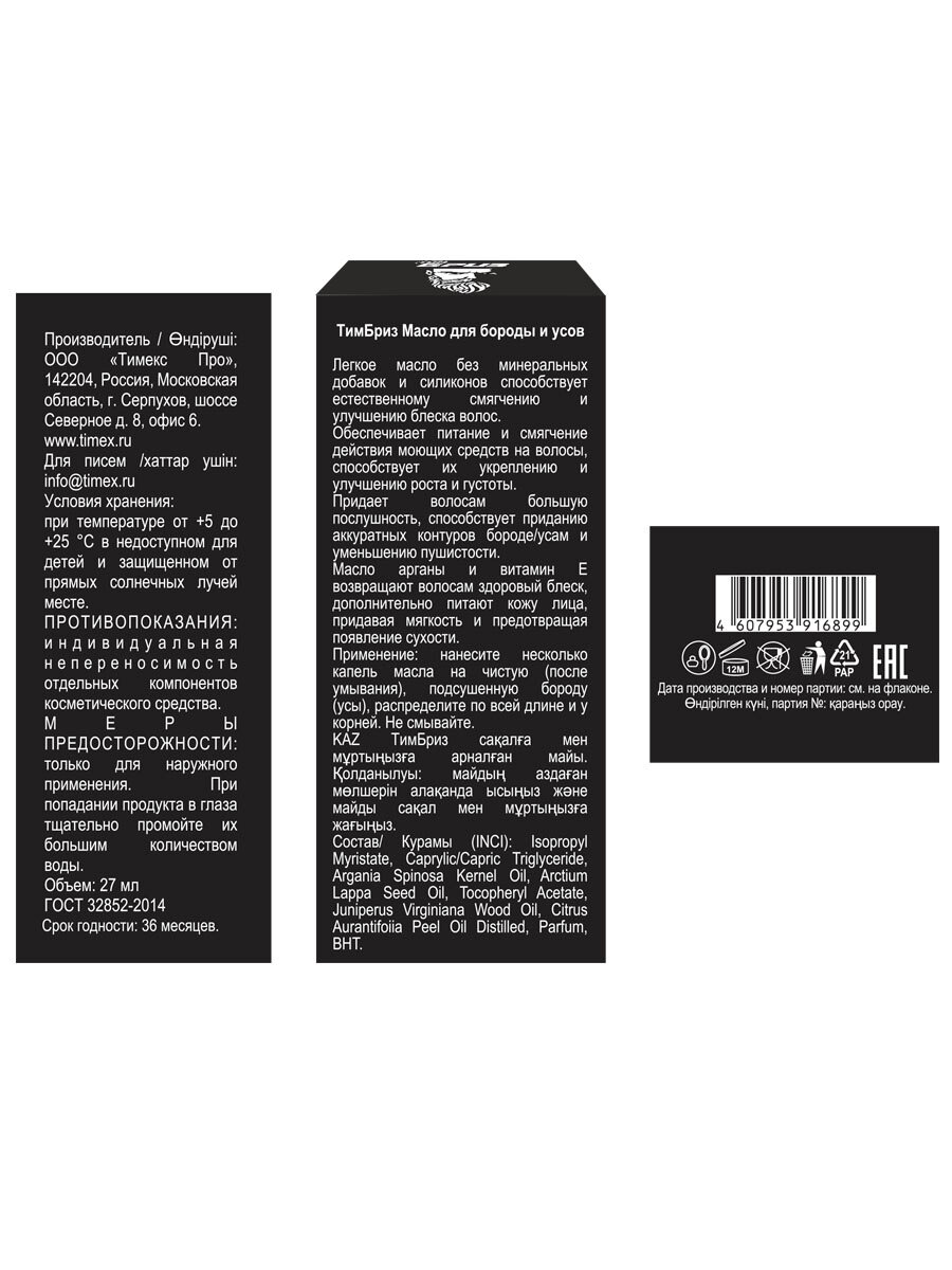 | Дополнительная информация | ТимБриз Масло для бороды и усов 27мл. Легкое масло без минеральных добавок и силиконов способствует естественному смягчению и улучшению блеска волос. Обеспечивает питание и смягчение действия моющих средств на волосы, способствует их укреплению и улучшению роста и густоты.Придает волосам большую послушность, способствует приданию аккуратных контуров бороде/усам и уменьшению пушистости. Масло арганы и витамин Е возвращают волосам здоровый блеск, дополнительно питают кожу лица, придавая мягкость и предотвращая появление сухости. |