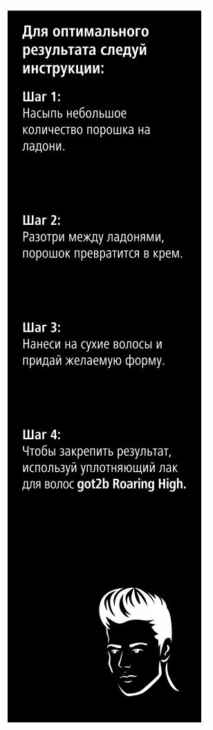 | Способ применения | насыпь небольшое количество порошка на ладони и разотри; порошок превратится в крем; нанеси на сухие волосы и придай желаемую форму |