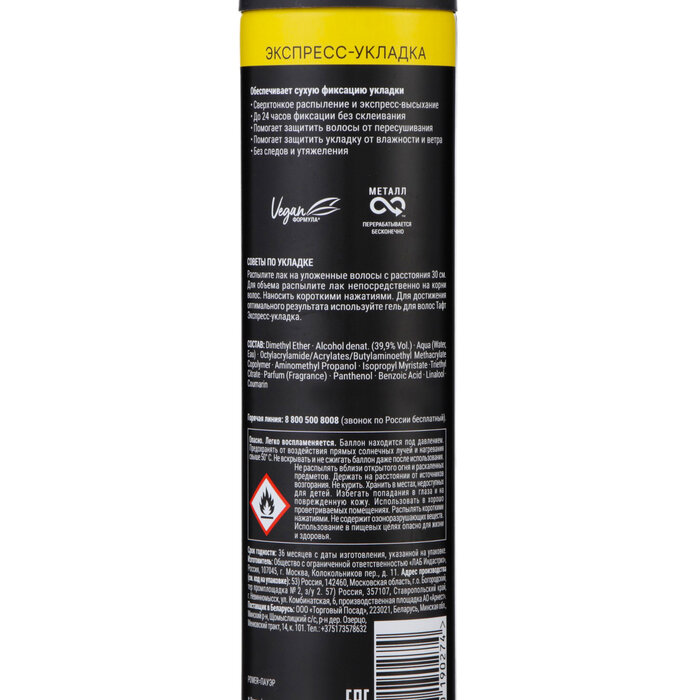 Опасно. Легко воспламеняется. Баллон находится под давлением. Предохранять от воздействия прямых солнечных лучей и нагревания свыше 50 °C. Не вскрывать и не сжигать баллон даже после использования. Не распылять вблизи открытого огня и раскаленных предметов. Держать на расстоянии от источников возгорания. Не курить. Хранить в местах, недоступных для детей. Избегать попадания в глаза и на поврежденную кожу. Использовать в хорошо проветриваемых помещениях. Распылять короткими нажатиями. Не содержит озоноразрушающих веществ. Использование в пищевых целях опасно для жизни и здоровья.