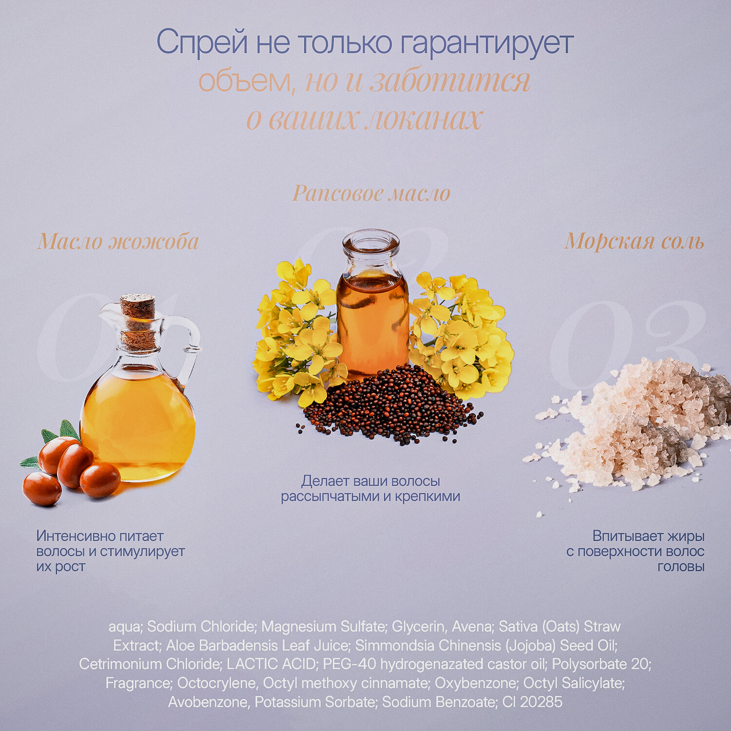 | Способ применения | Нанесите солевой спрей для волос на чистые влажные волосы и распределите средство на всю прикорневую зону. Выполните укладку феном, создавая прикорневой объем и объем по длине |