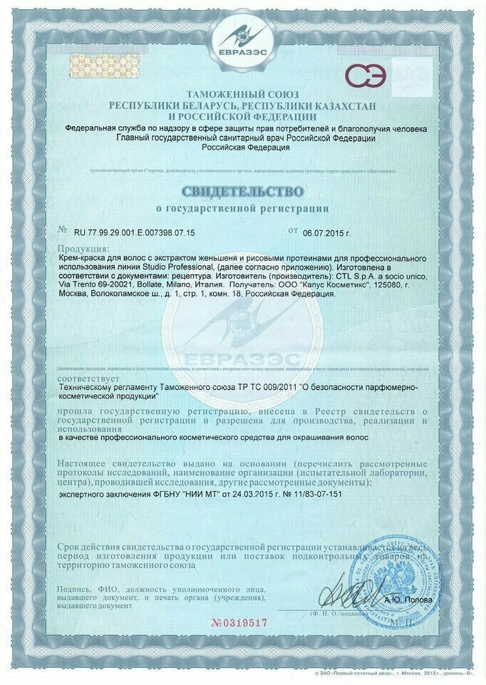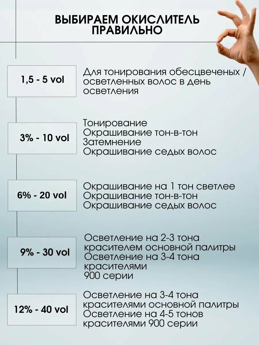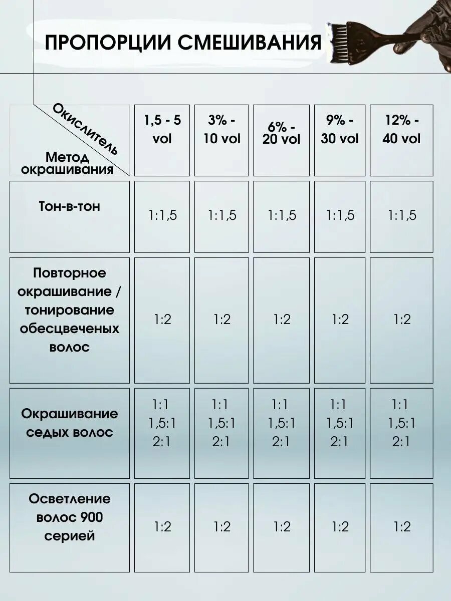 | Дополнительная информация | необходима предварительная диагностика перед окрашиванием; в первую очередь необходимо определить уровень глубины цвета натуральных волос и процент седины; для определения цвета волос использовать шкалу натуральных оттенков палитры; важно: в случае не точной диагностики и определения исходного цвета волос, цвет волос после окрашивания может не совпадать с выбранным из палитры на 100% |