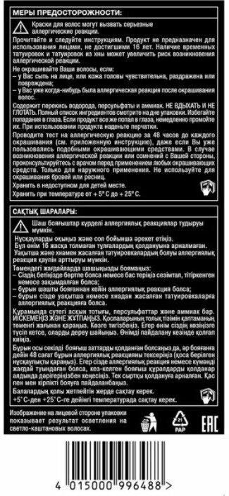 | Дополнительная информация | краски для волос могу вызывать серьезные аллергические реакции. Проведите тест на аллергическую реакцию. Продукт не предназначен для лиц младше 16 лет. Содержит перекись водорода. Избегать попадания в глаза |