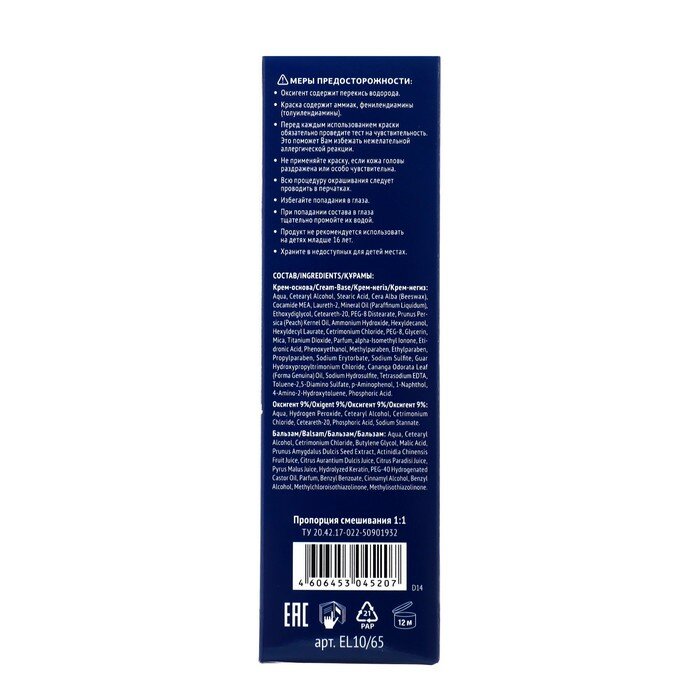 | Дополнительная информация | тест на чувствительности: приготовьте смесь из небольшого количества крем-основы и такого же объёма оксигента, перемешав их в любой неметаллической посуде. Не следует готовить весь объем краски. Нанесите приготовленную смесь на небольшой участок кожи на внутренней стороне локтевого сгиба или за ухом и оставьте на 10-15 минут. Затем смойте. Если в течение суток признаки аллергической реакции не появились, можете использовать краску |