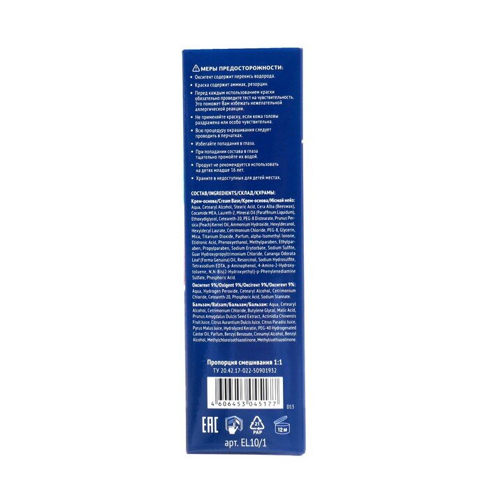| Дополнительная информация | тест на чувствительности: приготовьте смесь из небольшого количества крем-основы и такого же объёма оксигента, перемешав их в любой неметаллической посуде. Не следует готовить весь объем краски. Нанесите приготовленную смесь на небольшой участок кожи на внутренней стороне локтевого сгиба или за ухом и оставьте на 10-15 минут. Затем смойте. Если в течение суток признаки аллергической реакции не появились, можете использовать краску |