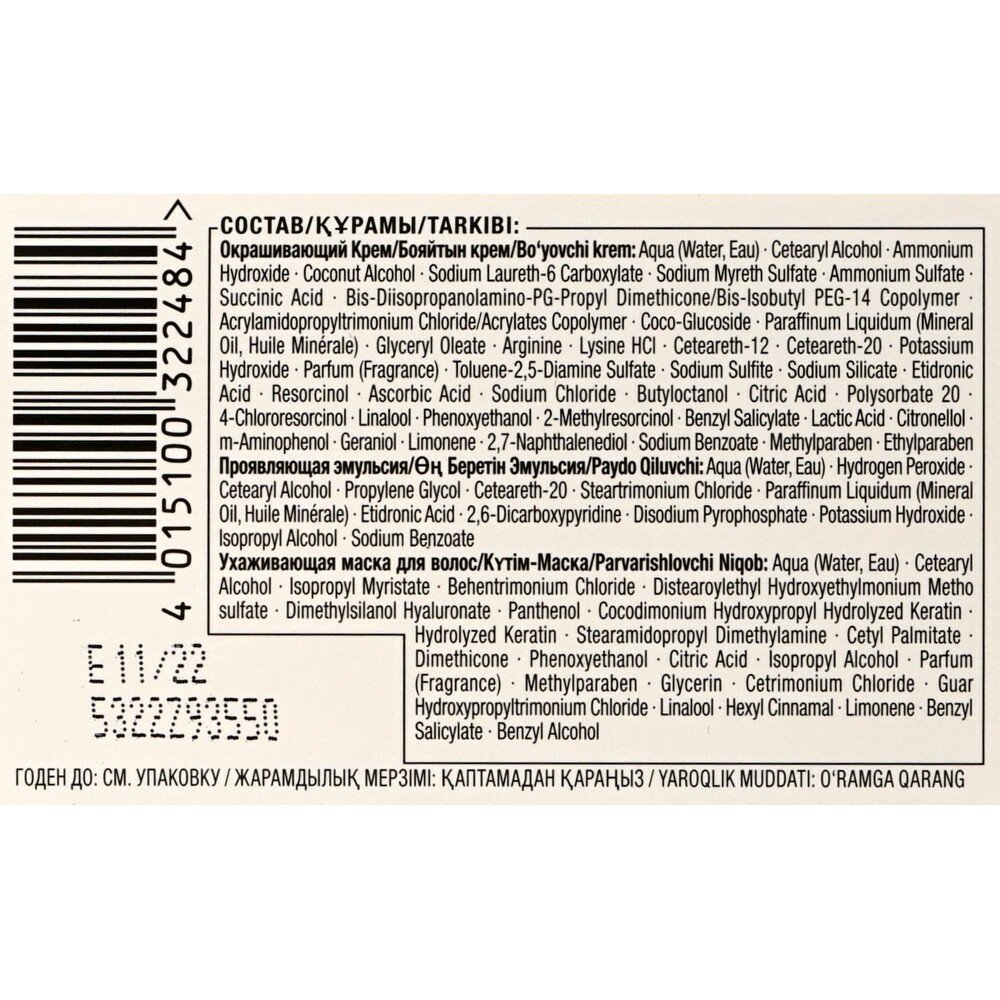 | Комплектация | 1 тюбик с окрашивающим кремом 60 мл, 1 флакон-аппликатор с проявляющей эмульсией 60 мл, 1 ухаживающая маска для волос 22,5 мл, 1 инструкция по применению, 1 пара перчаток |