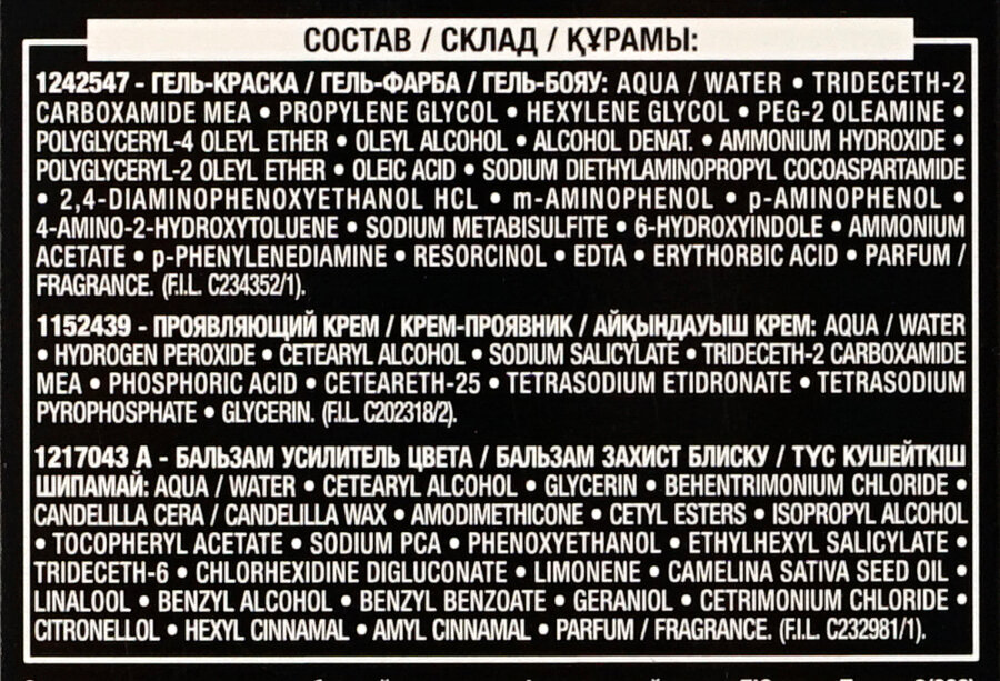 | Дополнительная информация | флакон гель-краски (60 мл), флакон-аппликатор с проявляющим кремом (60 мл), бальзам усилитель цвета (54 мл) |