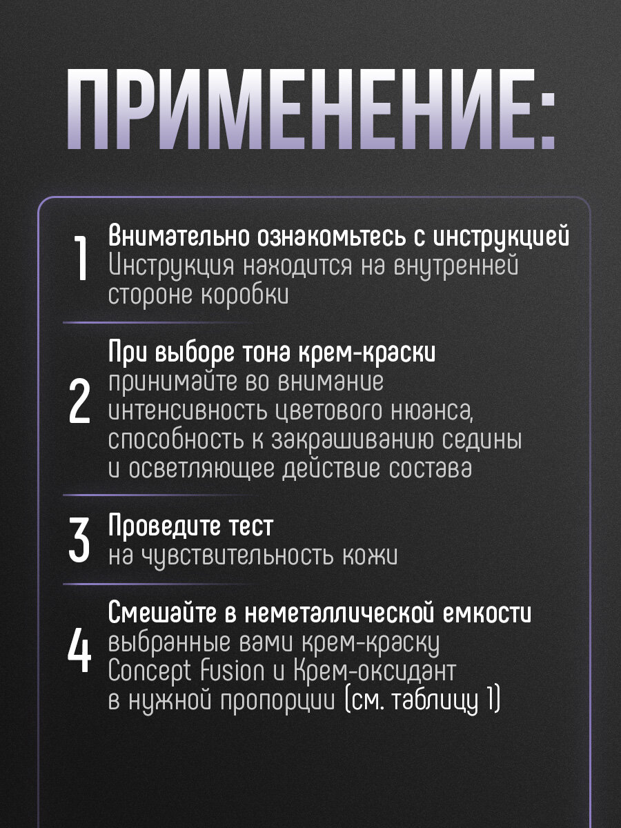 | Способ применения | Внимательно ознакомьтесь с инструкцией, прежде, чем использовать крем-краску Concept Fusion. При выборе тона крем-краски принимайте во внимание интенсивность, способность к закрашиванию седины и осветляющее действие состава. Проведите тест на чувствительность кожи. Смешайте крем-краску Concept Fusion и оксидант в пропорции 1:1. Окрашивающую смесь смешайте непосредственно перед нанесением на волосы. Выдержите окрашивающую смесь на волосах в течение рекомендованного времени. Смойте окрашивающую смесь шампунем. Рекомендуем воспользоваться 4-х ступенчатой системой ухода Super Miracle от Concept Fusion. |