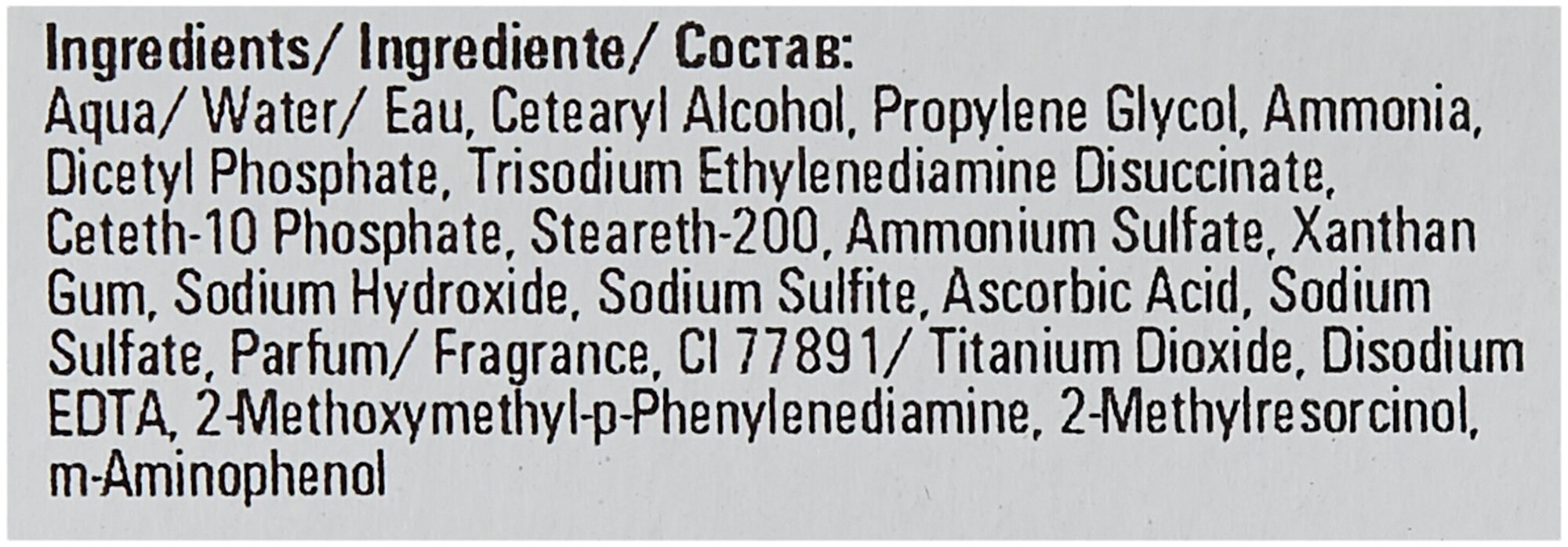 | Состав | aqua/ water/ eau, cetearyl alcohol, propylene glycol, ammonia, dicetyl phosphate, trisodium ethylenediamine disuccinate, ceteth-10 phosphate, steareth-200, ammonium sulfate, sodium sulfate, xanthan gum, sodium hydroxide, sodium sulfite, ascorbic acid, parfum/ fragrance, 2-methoxymethyl-p-phenylenediamine, ci 77891/ titanium dioxide, disodium edta, resorcinol, 2,4-diaminophenoxyethanol hcl |