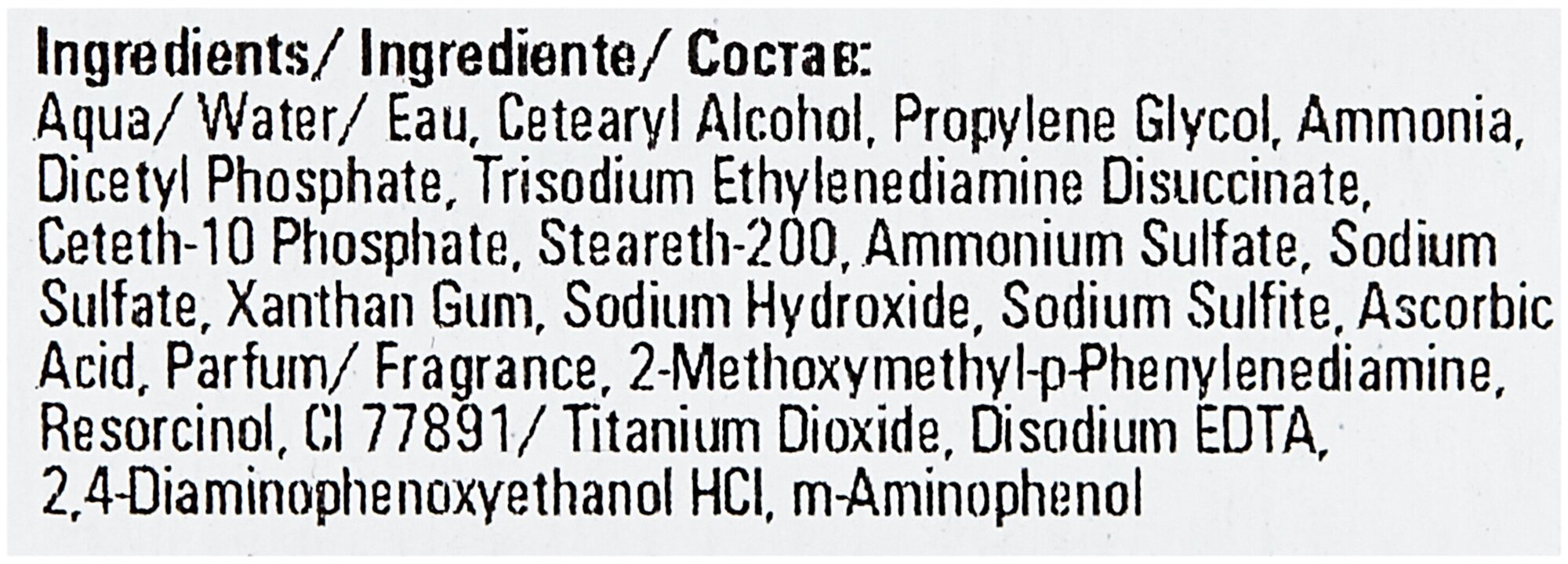 | Состав | aqua/ water/ eau, cetearyl alcohol, propylene glycol, ammonia, dicetyl phosphate, trisodium ethylenediamine disuccinate, ceteth-10 phosphate, steareth-200, ammonium sulfate, sodium sulfate, xanthan gum, sodium hydroxide, sodium sulfite, ascorbic acid, parfum/ fragrance, 2-methoxymethyl-p-phenylenediamine, ci 77891/ titanium dioxide, disodium edta, resorcinol, 2,4-diaminophenoxyethanol hcl |