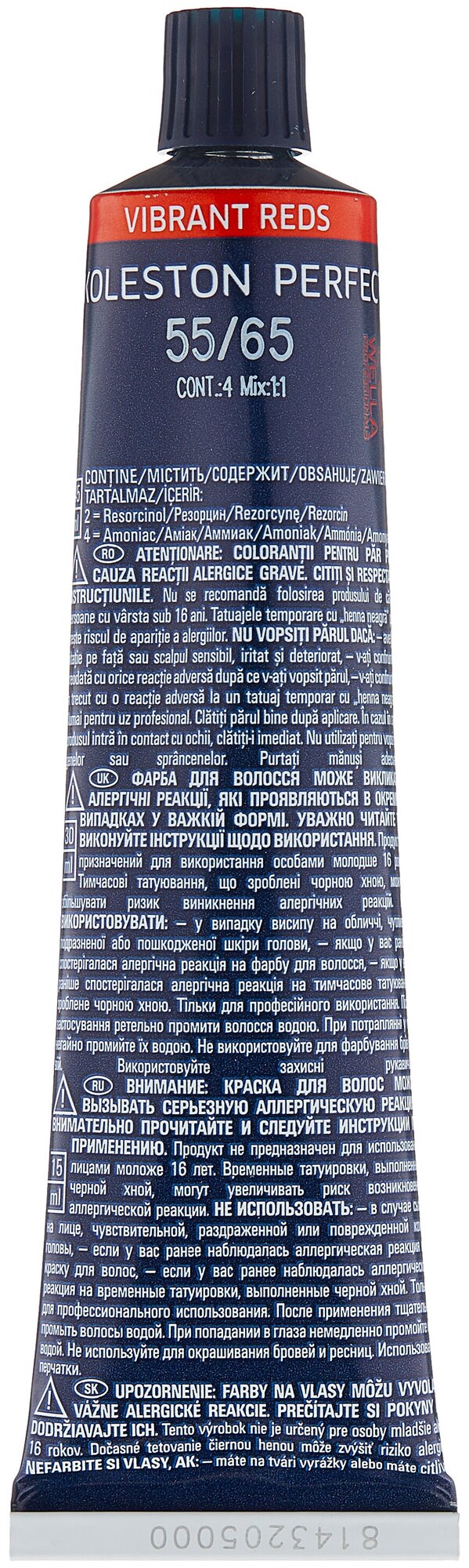 | Способ применения | смешайте краску с окислителем Welloxon Perfect в пропорции 1:1. Равномерно нанесите полученную смесь на чистые, влажные волосы по всей длине, уделяя особое внимание корням волос и кончикам. Оставьте для воздействия на 30-40 минут без тепла, 15-25 минут с теплом. Смойте остатки краски водой |