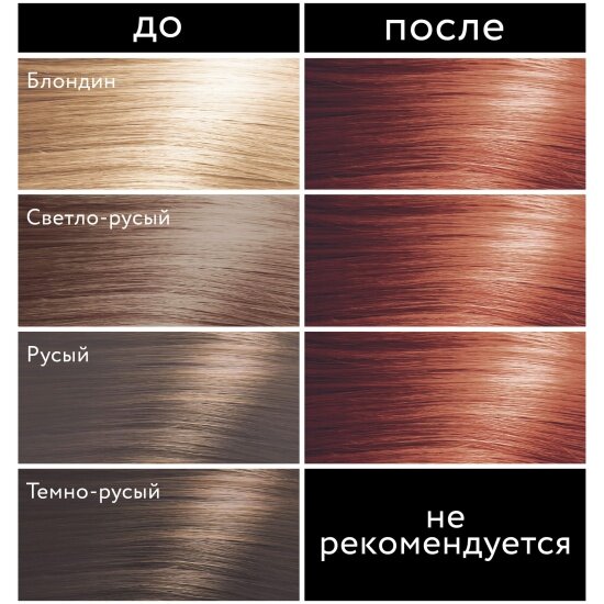 | Дополнительная информация | краситель – 50 мл, окислитель – 50 мл, бальзам – 15 мл Перед применением проведите тест на аллергическую реакцию. Не обязательно мыть волосы перед окрашиванием. Рекомендуется выдержать 2 недели до и после химической завивки. Не рекомендуется использовать краску на волосах, окрашенных хной. |