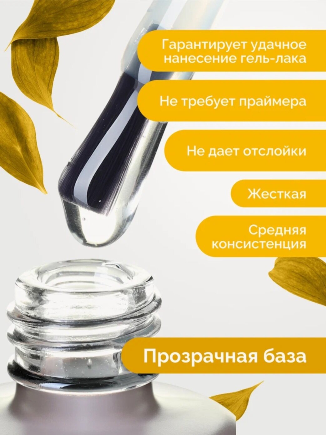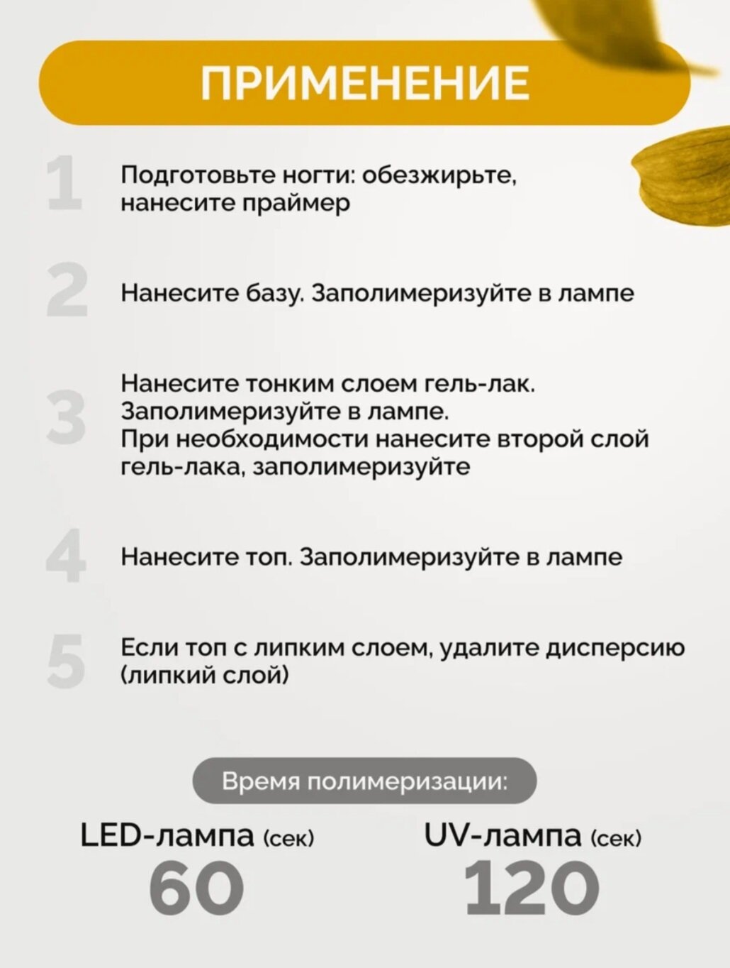 | Способ применения | база наносится на подготовленную, обезжиренную ногтевую пластину. Рекомендованное время полимеризации в UV-лампе – 2 мин., в LED-лампе – 30 сек. Липкий слой не снимается, он позволит гель-лаку прочнее закрепиться на ногтевой пластине |