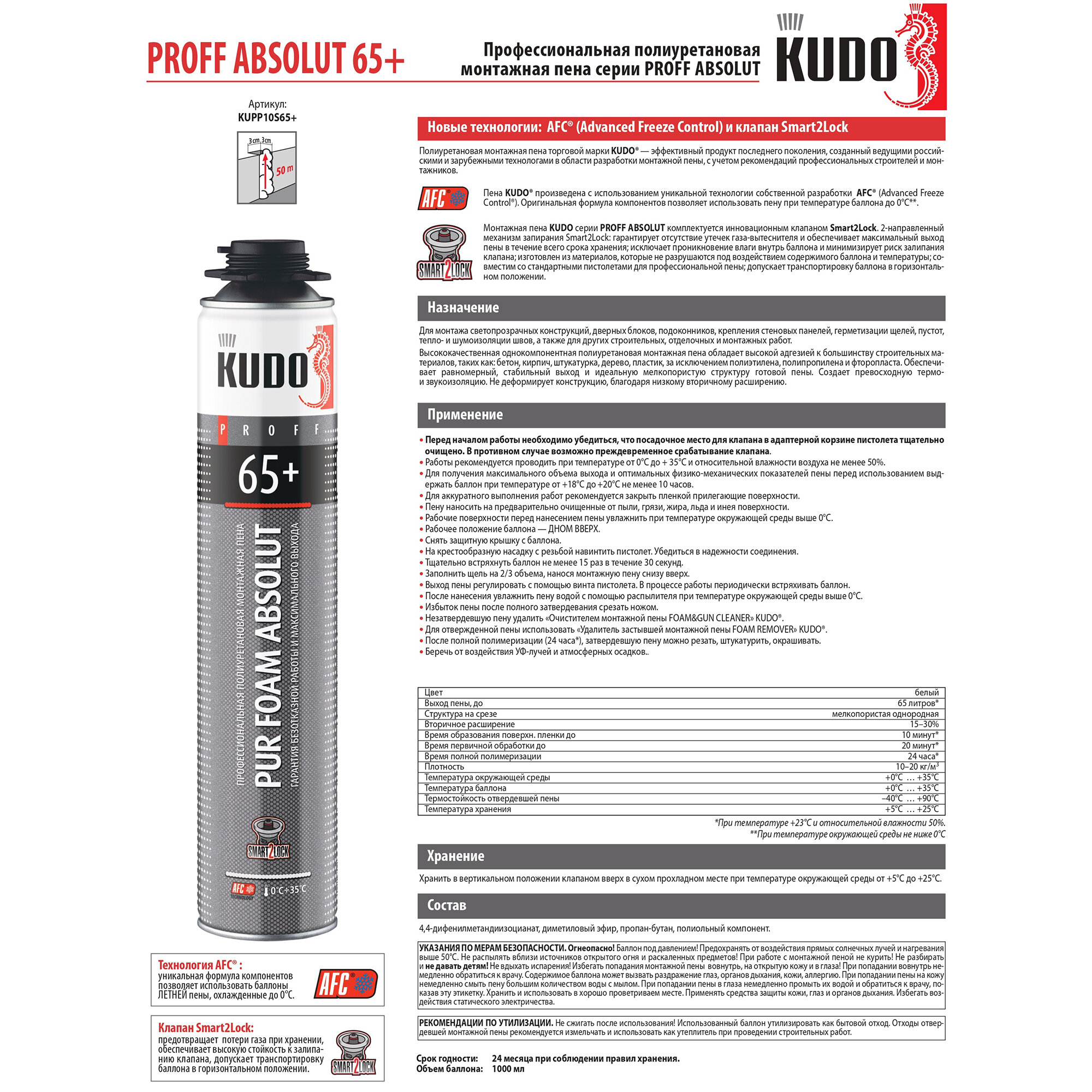 Кудо Профф 65+ пена монтажная профессиональная (1л) / KUDO Proff 65+ пена профессиональная полиуретановая монтажная (1л) интересное: